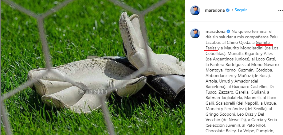 Enzo “Goma” Farías, fue el arquero del histórico Cebollitas, aquel equipo que vio la primeras gambetas de Maradona. Según publicó el medio La Arena, Farías es hijo de dos gastronómicos que por su trabajo, se mudaban muy seguido. Cuando Farías nació, el matrimonio se encontraba en San Andrés de Giles: “Papá era mozo y maitre, e iba cambiando de domicilio, por lo que nos mudamos varias veces hasta llegar a Almagro, donde me tocó hacer la primaria y el secundario” explicó el arquero al medio pampeano.Almagro queda a pocas cuadras de La Paternal, barrio potestad de Argentinos Juniors. Fue así que se acercó hasta el “Bicho” y empezó a entrenar con los Cebollitas, el histórico equipo infantil del club.Según detalló ante La Arena, Farías no solo compartió equipo con Diego, sino que hasta lo salvó en un campeonato: “Diego había errado en un partido anterior, y cuando tuvimos que definir por penales la final Francis (NdR: Cornejo, DT de Cebollitas), no lo puso en la lista“. La decisión del entrenador hizo que Maradona se quede llorando en un rincón. Ante el desconsuelo del futbolista, Cornejo tuvo que rever la lista de pateadores y finalmente, la joya del equipo entró. Sin embargo, falló de nuevo dejando al equipo contrario al borde de la victoria. Cuando se ejecutaban los últimos penales, dos atajadas de Farías consagraron a Cebollitas: “Fui al arco, vino el tiro y alcancé a sacar la pelota: no me había terminado de parar para festejar cuando Diego se me colgó del cuello. ¡Lo había salvado! Ganamos el campeonato“. Diego Maradona saludando a Gomita Farías en el Día del ArqueroGomita estaba a punto de debutar en primera, pero un tirón en un picado entre amigos hizo que todo se detuviera. Finalmente, no alcanzaría a jugar, y luego de que el histórico Toto Lorenzo dejara de dirigir a Argentinos Juniors, quedaría libre.Hasta ese momento había sido un jugador muy reconocido por el ambiente. De hecho, César Luis Menotti lo había preseleccionado para el mundial sub 20 de 1981 celebrado en Australia. Se trataba de un plantel que estaba integrado por figuras como Sergio Goycochea, el Chino Tapia, Jorge Burruchaga y el Turco García.Luego de quedar sin club, jugaría en Defensa y Justicia y en ligas regionales de la provincia para luego recalar en España e Italia: “Tuve problemas para obtener la ciudadanía italiana, y por eso no pude llegar a las categorías más importantes” comentó el ex arquero. En 1992, regresaría a nuestro país y se retiraría en Chacarita.Desde ese entonces, se encuentra trabajando como entrenador de arqueros en clubes como Olimpo, donde entrenó a Nereo Champan y a Mariano Andújar, o Los Andes, cuando recién empezaban a jugar Jonatan Maidana y Radamel Falcao. “Al colombiano lo probamos con chicos más grandes y hacía diferencias, y así fue que después fue a River. Falcao me adora y aún hoy tengo contacto” confesó.Actualmente, el primer arquero de Maradona reside en Toay, ciudad ubicada a pocos kilómetros de Santa Rosa, La Pampa. Entrena en el Club Atlético Santa Rosa, transmitiendo lo que aprendió desde que empezó en aquel histórico equipo junto a Maradona.Fuente: La Arena.