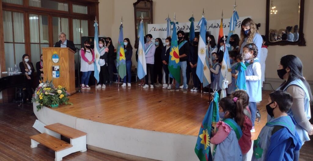 En el lugar estuvieron presentes los abanderados y escoltas de los jardines 901 y 903, y de las escuelas 2, 12 y 1; el intendente Carlos Puglelli; los concejales Bonetti, Mariño y Castaños; la presidenta del Consejo Escolar, Micaela Albeverio, junto a los consejeros Marcelo Casas y Julieta Piazzi; el comisario Javier Roldán y el subcomisario Cristian Ravasano; y la secretaria de Desarrollo Humano y Acción Social, Julieta Faiad.