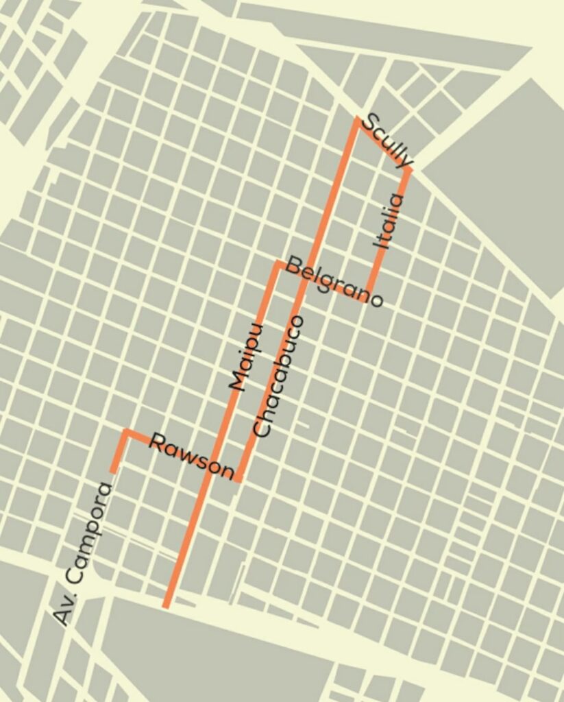 El recorrido será por las siguientes calles:Ingresará desde colectora por Maipú hasta Belgrano, de Belgrano hasta Italia, de Italia hasta Scully, por Scully hasta Chacabuco, de Chacabuco hasta Rawson, terminando su recorrido por Av. Cámpora hasta la terminal.