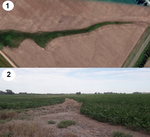En dicha exposición, se puso énfasis en el impacto que está generando la actividad agrícola y ganadera en los cursos de agua y su área circundante o área de ribera. Ya hemos señalado que estas actividades forman parte de la economía de nuestro municipio que, como muchos otros municipios pampeanos, tiene una larga tradición rural. El proceso de agriculturización implica una creciente ocupación del espacio rural y una mayor intensidad del uso del suelo, a través de la aplicación de agroquímicos (tales como herbicidas, pesticidas y fertilizantes), que llegan a ingresar, a partir del proceso de escurrimiento, a los cursos de agua. En este sentido, el transporte y deposición de contaminantes y la ocupación de la agricultura en las áreas de ribera, generan la disminución de la biodiversidad y la pérdida de hábitats naturales. En la siguiente imagen de una parcela rural en las proximidades de la localidad de Azcuénaga, se puede apreciar este proceso de degradación de un curso de agua temporario y su área de ribera. La secuencia temporal, indica el avance de la agricultura sobre el área de ribera hasta llegar a ocupar el propio cauce del curso de agua, eliminando por completo este ecosistema.