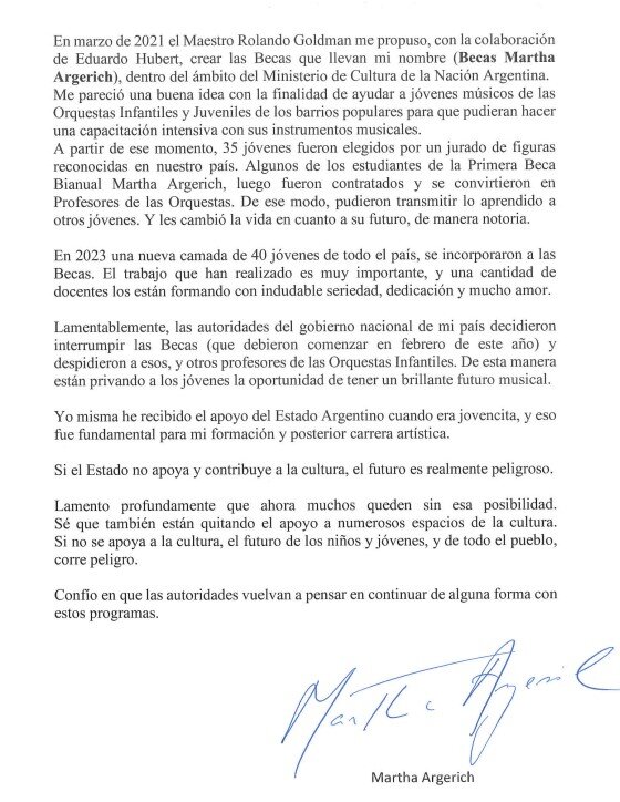 La prestigiosa pianista argentina Martha Argerich escribió una carta abierta sobre la decisión del presidente Javier Milei de cerrar el programa de becas que lleva su nombre. “Si el Estado no apoya y contribuye a la cultura, el futuro es realmente peligroso”. Las becas de apoyo a estudiantes están destinados a integrantes de orquestas infantiles y juveniles para que se desarrollen como profesores de música.