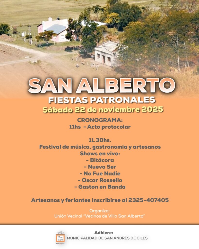 Este sábado 22 de noviembre se realizarán las Fiestas Patronales en la localidad de San Alberto, ubicada en el kilómetro 114 de la Autovía Nacional Nº 7, en el partido de San Andrés de Giles. La jornada contará con actividades protocolares, propuestas culturales y un festival musical abierto a toda la comunidad.