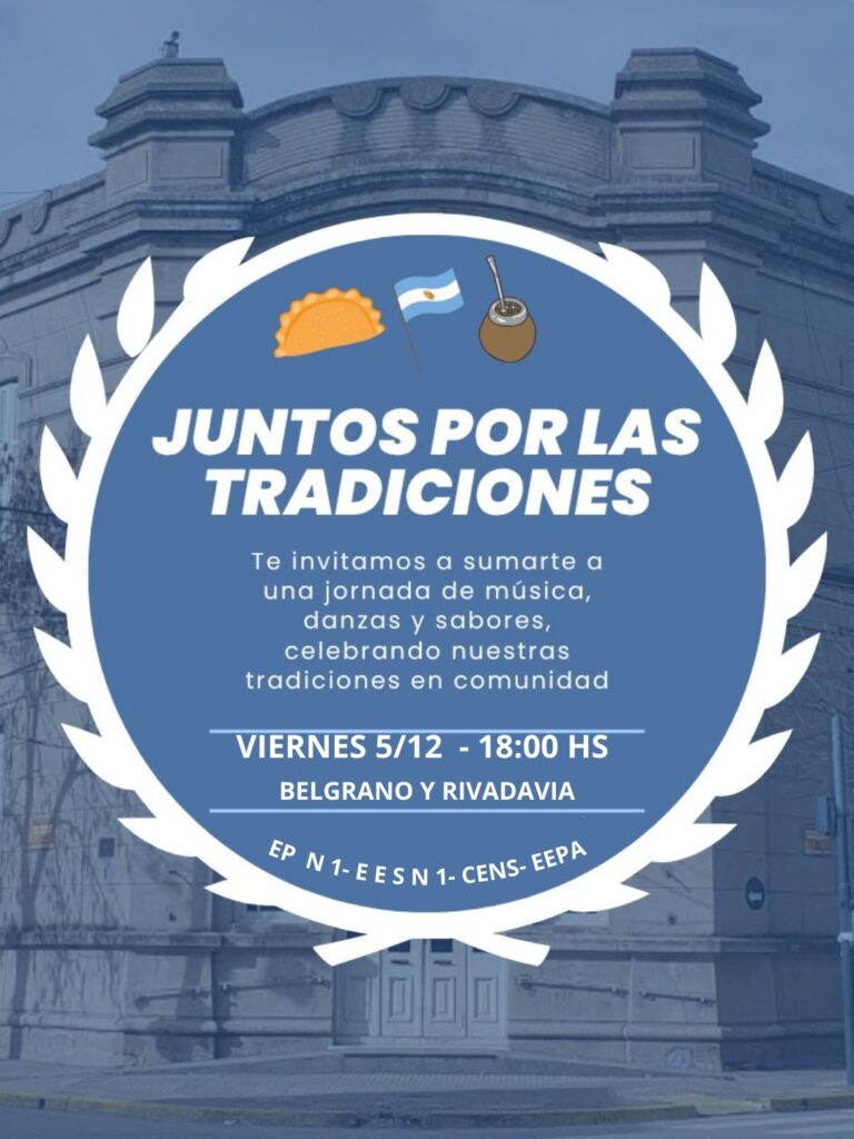 El viernes 5 de diciembre, desde las 18 horas, la emblemática esquina de Rivadavia y Belgrano se vestirá de fiesta. La Escuela N° 1 cortará la calle para organizar un gran evento honor al Día de la Tradición, que reunirá a toda la comunidad educativa que habita su histórico edificio. El evento estaba programado para noviembre, pero se postergó por mal clima. Para este viernes anuncian un clima ideal, una noche de verano para disfrutar.