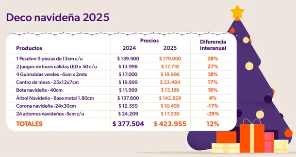 Según el informe, los productos que más aumentaron en la decoración navideña son, en primer lugar, el clásico Pesebre (28%), seguido por un juego de luces cálidas LED x 50 unidades (27%) y las guirnaldas verdes (8%). Por el contrario, los ítems que registraron menores incrementos fueron los adornos navideños (-29%), las coronas navideñas (-17%) y el Árbol en sí (4%).
