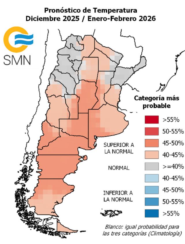 El pronóstico climático trimestral desarrollado por un amplio grupo de profesionales de diversas instituciones (como el Servicio Meteorológico Nacional; el Instituto Nacional del Agua, la Cátedra de Climatología Agrícola de la Facultad de Agronomía (UBA); el Departamento de Ciencias de la Atmósfera y los Océanos de la UBA, el INTA y el CONICET, entre otros) prevé para los meses de diciembre, enero y febrero, una mayor probabilidad de temperaturas superiores a las normales sobre el centro y norte de Patagonia, La Pampa, oeste de Buenos Aires, Córdoba, este de San Luis y oeste de Santa Fe.