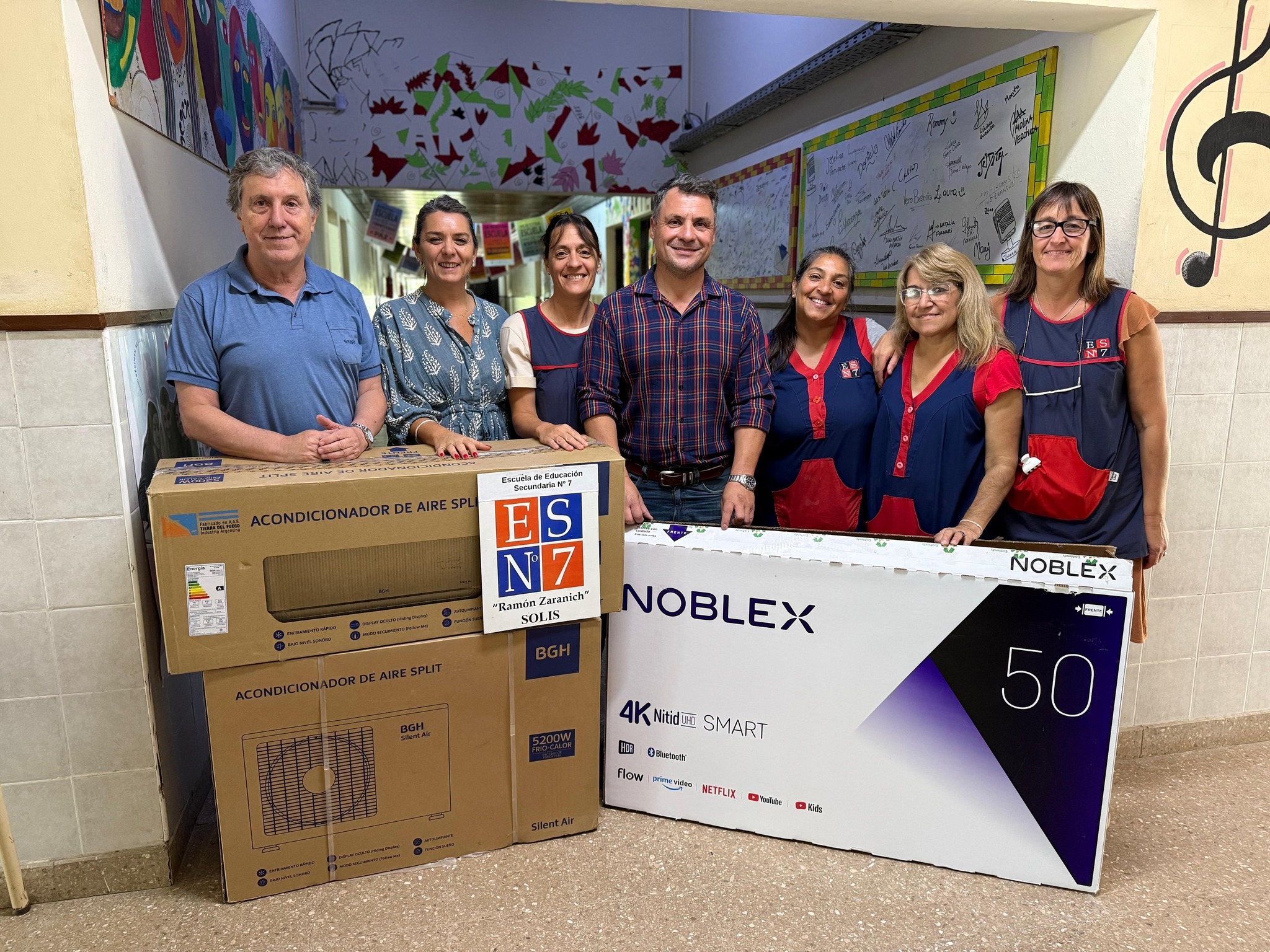 El intendente de San Andrés de Giles, Miguel Gesualdi, junto al director Municipal de Políticas y Gestión Educativa, Gustavo Lennard, y la presidenta del Consejo Escolar, Daiana Gallo, visitaron este jueves 20 de marzo la Escuela de Educación Secundaria (E.E.S.) N° 7 “Ramón Zaranich” de Solís. Durante la visita, entregaron un aire acondicionado frío/calor de 5200 watts y un Smart TV de 50” con calidad de imagen 4K, elementos que habían sido solicitados por la Asociación Cooperadora de la institución.