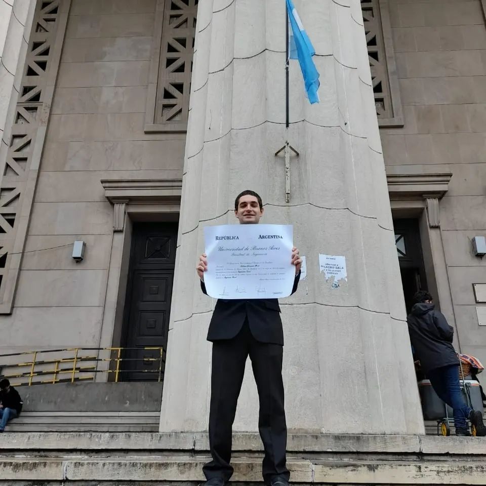 Egresado de la Universidad de Buenos Aires en el 2022, trabajó en el Ente Nacional de Obras Hídricas de Saneamiento desde el 2021 hasta este año, como analista técnico. También se desempeñó en el sector privado en Fortis Argentina, Montajes Especiales.