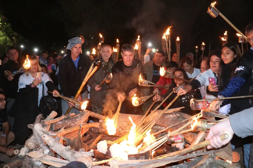 A las 21:10 h, familiares de los caídos realizarán el izamiento de la Bandera Nacional, seguido del encendido del fogón criollo (21:30 h). La vigilia llegará a su pico emotivo con la consagración al Sagrado Corazón de Jesús (21:55 h) y el encendido de 649 antorchas a la medianoche, acompañado del Himno Nacional Argentino.