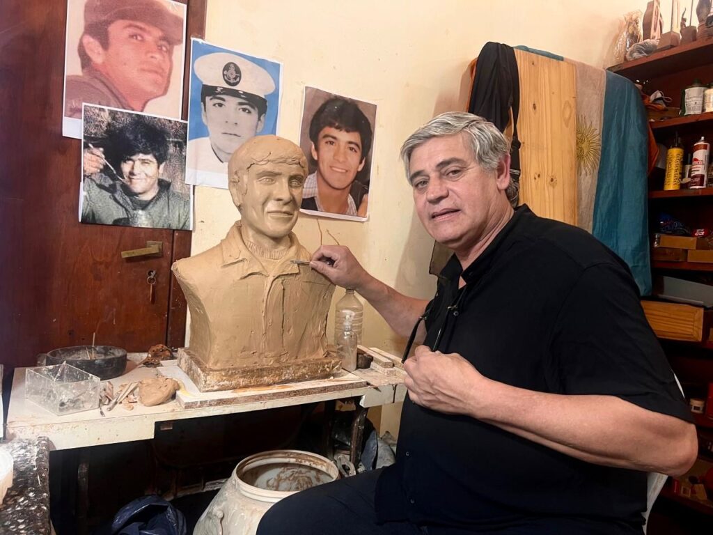 Infociudad lo visitó en su espacio de trabajo para conocer los detalles de su labor, mientras trabaja en tres nuevos bustos que viajarán a Salta. Se trata de las obras en homenaje al soldado Jorge Luis Sisterna, un joven de 20 años oriundo de Orán, que fue el único caído de su ciudad en la guerra de Malvinas.