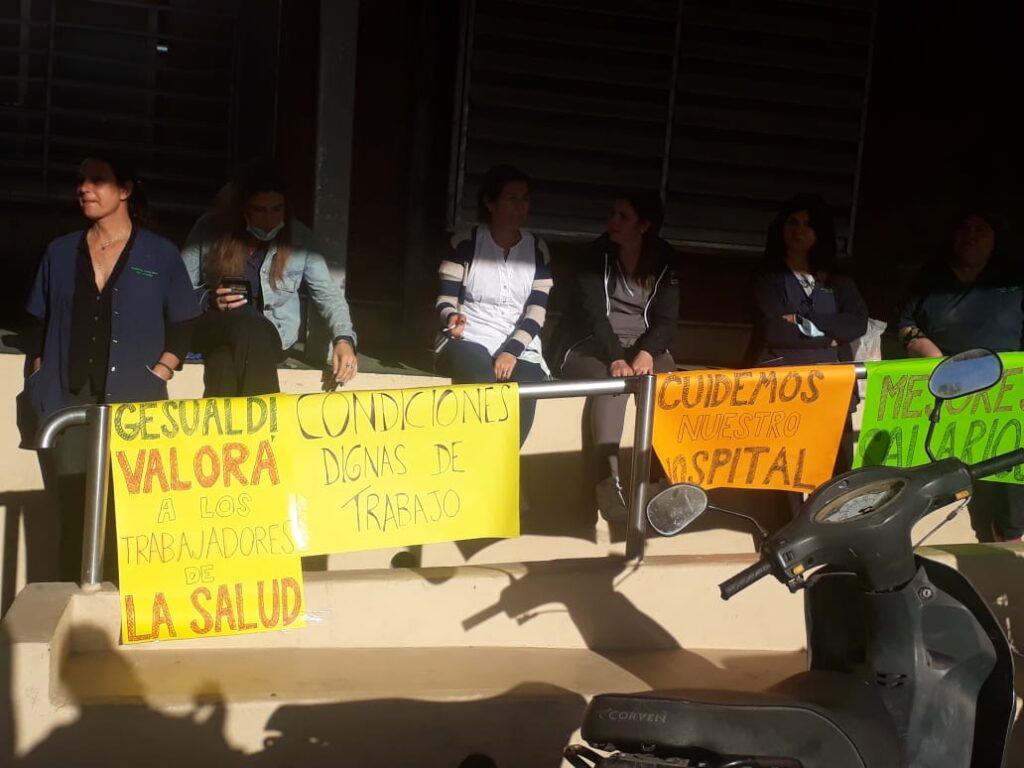 ¨Condiciones dignas de trabajo¨, ¨Cuidemos el hospital¨ y ¨Gesualdi valora a los trabajadores de la salud¨ son algunas de las pancartas que sostienen las y los integrantes del único efector de salud de la ciudad.