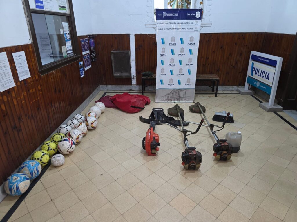 Patrullas que se encontraban en recorrida por la ciudad actuaron con rapidez y lograron detener a los sospechosos. Tras la intervención, se encontraron en su poder todos los elementos robados: varias pelotas de fútbol, dos desmalezadoras, una sopladora y diversas herramientas.
