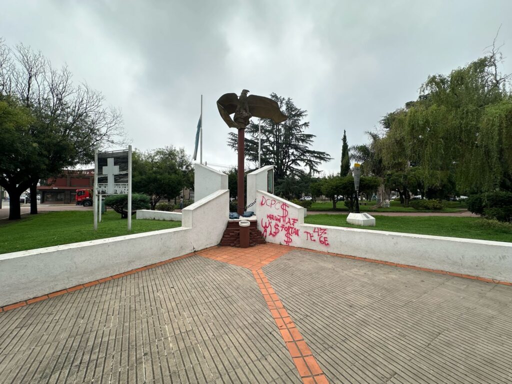 Esta mañana el Monumento que homenajea a los caídos en la Guerra de Malvinas apareció con pintadas. El espacio de memoria que está ubicado en la Plaza Colón es un emblema de San Andrés de Giles, capital de la Malvinización. En una radio local Alberto Puglelli, presidente del Centro de Combatientes local, aseguró que ya radicaron la denuncia en la comisaría.