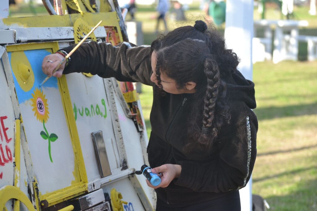 En la segunda jornada, los artistas se encargaron de pintar el frente del cartel, mientras que los niños, adolescentes y familias que participaron en el taller lo intervinieron en la parte trasera, añadiendo el nombre del taller, la firma de cada uno y el logo de Ojos de Campo.