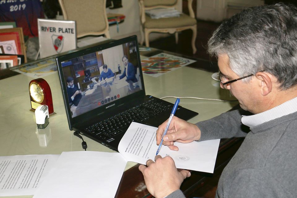 Carlos Puglelli, mediante teleconferencia con el gobernador, firmó hoy el convenio por 9.1 millones de pesos. En el encuentro virtual también estuvieron el jefe de Gabinete de Ministros Carlos Bianco y el Ministro de Hacienda y Finanzas Pablo López.