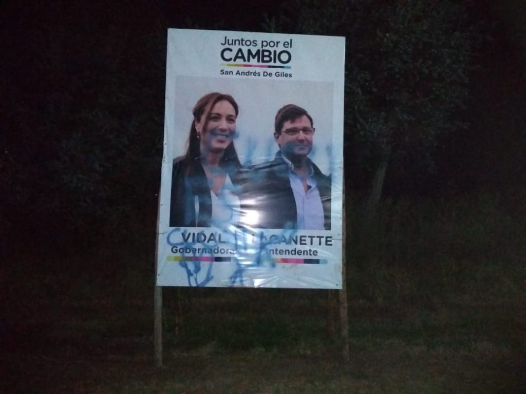 Cuándo todo tendría que ser una fiesta de la democracia, el vandalismo irrumpió en una localidad. La gigantografía de Lacanette en Cucullú fue pintada con aerosol. Inscripciones en azul dañan la imagen principal del cartel.